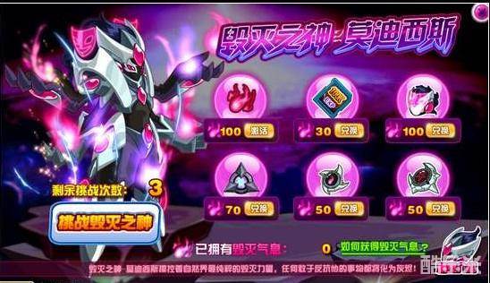 动画结束后打开活动界面。每天3次挑战毁灭之神的机会,挑战过程中可获得毁灭气息,集齐100个毁灭气息可兑换莫迪西斯精元。