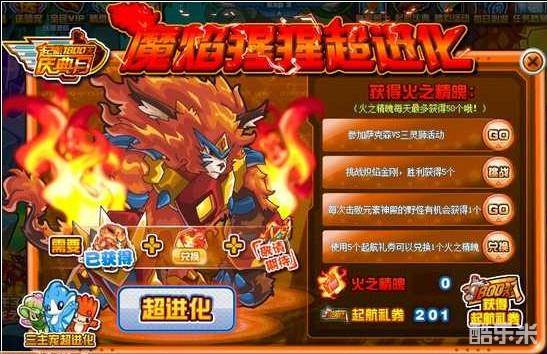 动画剧情结束后,出现活动弹窗。魔焰猩猩超进化需要三个要素,魔焰猩猩精灵+炽焰战力+炽焰斗魂。3月21日开启炽焰战力获得,3月28日开启炽焰斗魂获得。炽焰战力需要60个火之精魄兑换,每天做多获得50个火之精魄,至少两天才能获得60个,兑换到炽焰战力。