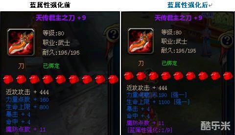 蓝属性强化会对装备已有的蓝属性进行随机强化,强化后的该装备某些蓝属性的数值将得到提升,每次强化时,所有强化数值会重新分配,强化次数越多蓝属性能够得到的提升越高。每件装备最多可以强化9次,玩家等级与装备等级的差值决定目前玩家可以强化该装备的次数。