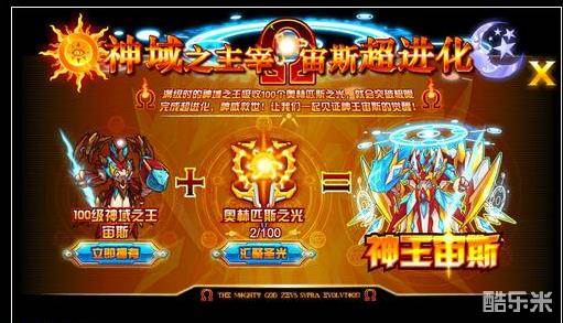 一段动画过后,进入活动界面。想要获得超进化的宙斯,需要拥有宙斯,并且收集100个奥林匹斯之光,兑换超进化道具。超进化道具除了收集之外,还可以点击左下角的一件获得,价格400钻石(40米币)。