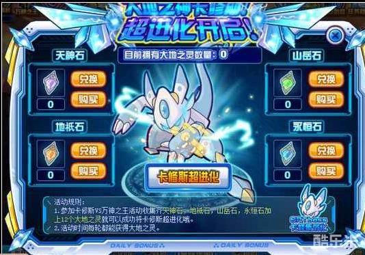 参加活动收集大地之灵,卡修斯超进化需要天神石、地衹石、山岳石、永恒石和12个大地之灵。天神石需要8个大地之灵兑换或200个钻石购买,地衹石需要6个大地之灵兑换或60个钻石购买,山岳石6个大地之灵兑换或80个钻石购买,永恒石需要12个大地之灵兑换或40个钻石购买。