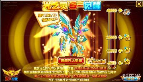 在出现的活动界面中,可以【挑战光之灵S】,即可战斗。战斗中我方精灵对光之灵S造成的伤害,是可以累积的,不受光之灵回血的影响哦。累积伤害4200,可以获得1级光系全能精元;达到13000,可以获得2级光系全能精元;累积伤害达到25000,可以获得3级光系全能精元;累积伤害达到42000,可以领取光之灵DNA。