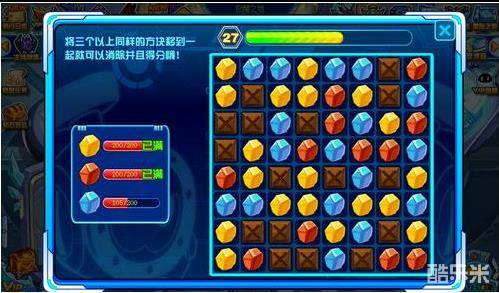 进入游戏后,小游戏非常简单。只要相同颜色的方块横竖三个以上连在一起,就会被收集(就是消除啦)。每种收集到200个,任务完成。