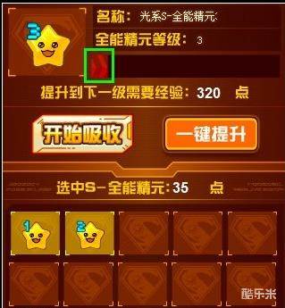 点击上图中的全能精元升级,会出现下图的升级界面中,选中被吃的精元,可以获得相应的经验点。3级升4级需要320点精元,而吃1级的全能精元可以提升10点精元、吃2级的可以提升25点,吃3级的可以提升60点,吃4级的可以提升140点(一般都不会吃4级的吧)。