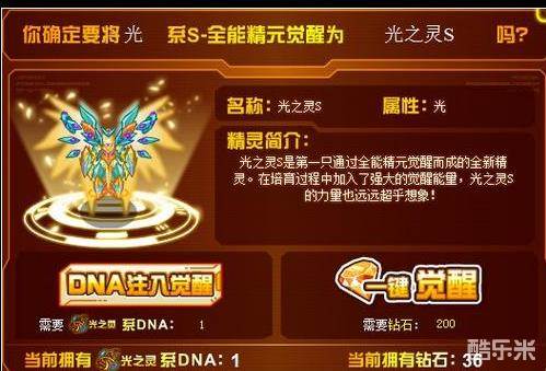 再出现的活动界面中可以看到,需要6个4级的光系能量,才可以完成觉醒。前面的攻略中有讲到过如何活动,不清楚的赛尔可以往回看看攻略。准备OK后,如果你是想觉醒成光之灵S,你就要有前面说道的光之灵DNA,然后点击指定觉醒。(如果没有的话,只能点击左侧的【开始S-觉醒】碰运气了)