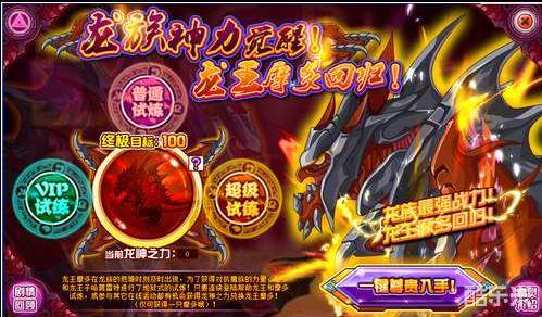 第二种方法,通过试练获得摩多,目标获得100个龙神之力。其中VIP用户可以通过左侧的按钮,直接领取5个龙神之力;点击普通试练,需要挑战摩多获得龙神之力(推荐);点击右侧超级试练,则是40钻石10个龙神之力(和一键购买普通版价格基本相同)