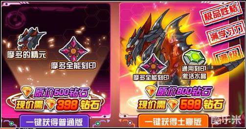 第一种,一键购买,普通套装价格398钻石(大约40米币),送摩多的精元和全能刻印;土豪套装价格598钻石,可以获得满级极品性格、满学习力的摩多,摩多全能刻印和通用刻印水晶。