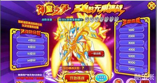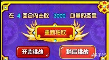 挑战要求随机抽取,由左边的回合数与右边的血量组合,即在规定的回合内战胜拥有规定血量的圣皇即可。
