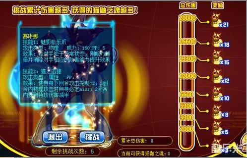 点击开始挑战,会进入挑战界面。每次挑战累计有5次机会,每次挑战的胜利可以累加。5次挑战总伤害达到2万以上,就可以获得最多21个猫鼬之魂。