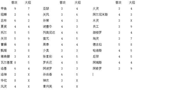 打南瓜说实话,不是为了体力,体力是固定60啦,主要是为了后面给的箱子,目前最多是10个,为了这十个箱子,必须单回合连击过55才行。连击还不是靠将普攻连击数累加来决定,因此我做了个表格供大家参考。(PS:伏羲、周瑜、赵云我没有所以搞不出来啦,见谅!)