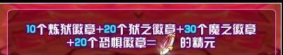 集齐10个炼狱徽章、20个狱之徽章,30个魔之徽章,20个恐惧徽章就可兑换炼狱小神精元啦!