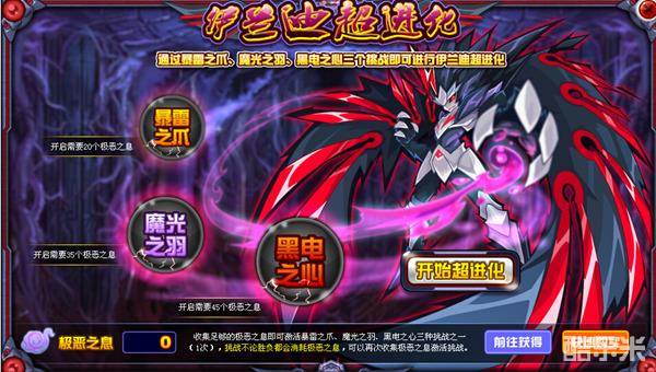 进入伊兰迪超进化活动,想要伊兰迪超进化需要通过暴雷之爪、魔光之羽、黑电之心三关挑战。每关都需要使用极恶之息开启,暴雷之爪需要20个极恶之息开启,魔光之羽需要35个极恶之息开启,黑电之心需要45个极恶之息开启。