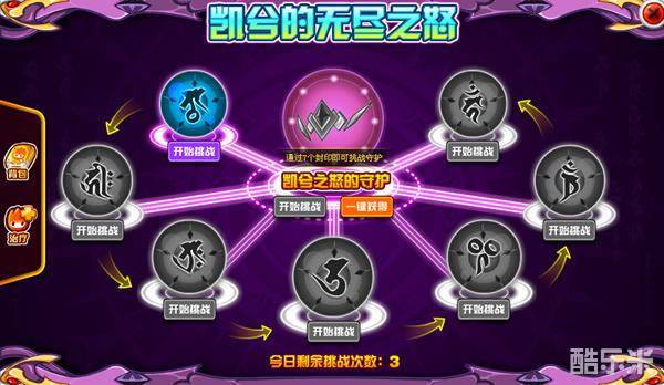 规则和之前的一样,凯兮之刃有7个BOSS,每天可挑战3次,需要3天完成。第一关是扎尔酷,上斯普林特灵魂寄托自爆后,上圣奥斯卡大招攻击胜利。