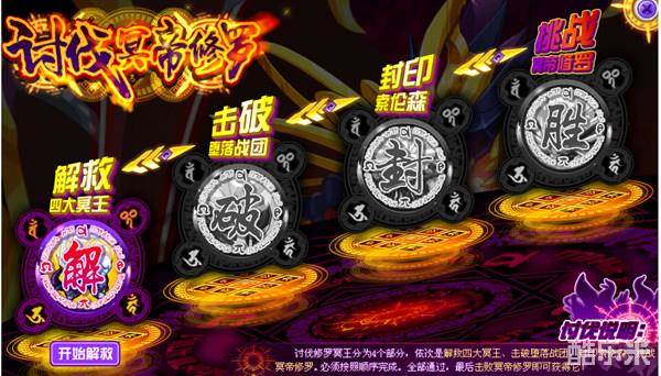下面我们来看下如何通过坑爹挑战来获得冥帝修罗。挑战分为4部分组成:解救四大冥王、击破堕落战团、封印索伦森、挑战冥帝修罗。4部分全部完成才可获得精灵冥帝修罗。