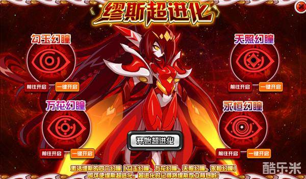 缪斯的超进化分为4部分活动,完成勾玉幻瞳、万花幻瞳、天照幻瞳、永恒幻瞳,就可实现缪斯超进化啦。