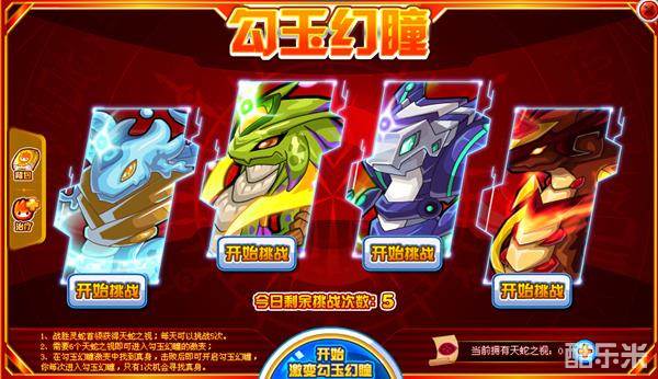 每天5次挑战,挑战灵蛇一族精灵,挑战灵蛇可获得天蛇之视,集齐6个天蛇之视就可进入勾玉幻瞳,在勾玉幻瞳中找寻真身,并打败真身,就算完成了勾玉幻瞳的挑战啦!