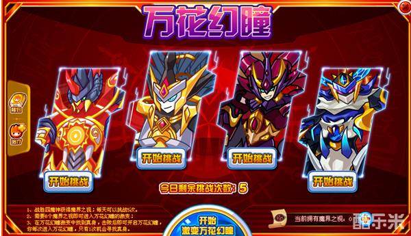 每天5次挑战机会,打败四大魔神可获得数量不同的魔界之视。集齐6个魔界之视就可激变万花幻瞳,打败万花幻瞳中的真身BOSS,就可通过该关挑战。