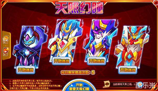 这个挑战和前面的一样,每天5次机会,打败神话系列精灵,可获得数量不同的神界之视。集齐9个神界之视,就可进入到天照幻瞳中,打败真身BOSS,就可通过该关挑战。