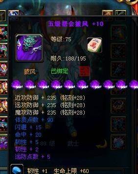 披风:韧性 理由还是一样的 有了韧性 不怕挨揍 锻炼身体 保卫自己 可以使用3个102 或者追求属性极限 打韧性石头