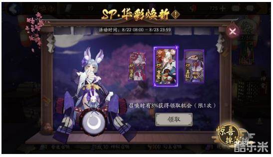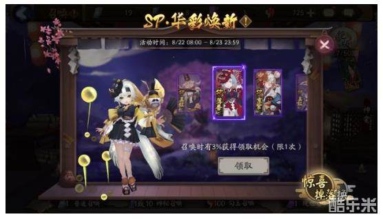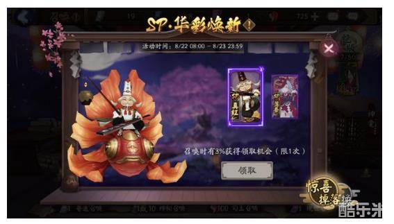 本次SR式神的新SP皮肤入手方法不算太难,在活动期间(8月22日8点开始到8月23日23:59)抽卡有概率获得自选的SP皮肤的机会1次。当然也能通过用金御札进行交换获得,不过仅能获得一次而已,不过官方也实锤了本期的SP皮肤将在未来版本加入卡池。获得机会不会顺延到下次的活动,没领的话会进行随机发放,有困难选择症的话可以考虑一下用这个方法来决定。