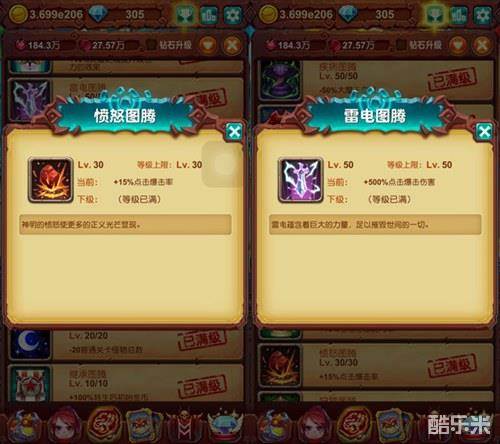 而想要提升自己的暴击率,“愤怒图腾”和“雷电图腾”绝对是勇者们的首选,这两个图腾,前者可以增加勇者们的暴击概率,最高达到15%,后者则是增加勇者们的暴击伤害,分分钟让原本的暴击伤害增加500%。绝对可以帮助勇者们瞬间飞起来,什么魔王都不再是阻碍勇者前进的难关!