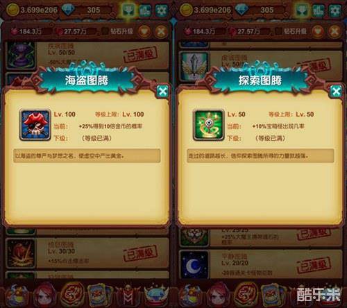 在暴击率提升后,勇者们又可以开心的闯关冒险了。而闯关推图最重要的还是为了收集金币,是自身变富饶。这时“海盗图腾”和“探索图腾”就要发威了。先说海盗图腾的10倍金币出现概率增加,完全可以让勇者们多多体验大把金币从天而降的快感。而探索图腾则可以增加宝箱怪的出现概率,宝箱怪意味着什么?金币啊!大把的金币啊!所以这两个图腾勇者们一定不能放过。