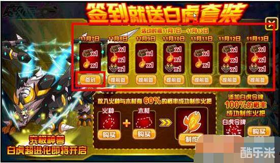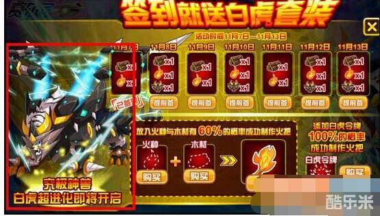 究极神兽白虎进化即将开启,超强福利白虎套装参与就送!点燃一个火把,即可获得一件白虎套装部件!快来为白虎超进化加油助威吧!