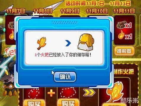 紧接着每天都可以进行签到一次,从11月7日~11月13日,每天一次签到,当然还可以提前签到哦!不过需要花费2钻石才能签到1次。11月7日签到就可以获得火种与木材了。