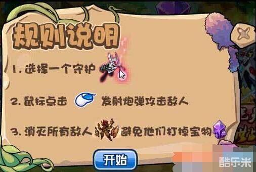 守护宝物规则:①选择一个守护宝物的精灵。②鼠标点击发射炮弹攻击敌人。③消灭所有敌人,避免敌人打掉宝物。