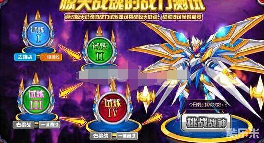 普通用户每天每关有3次挑战机会,超NO用户每天每关有5次挑战机会。普通挑战胜利后可获得1点惊天战能,中等挑战胜利后可获得2点战能,困难挑战胜利后可获得5点战能。集齐100点战能就可通过试炼3。普NO用户需要5天完成,超NO用户需要3天完成。