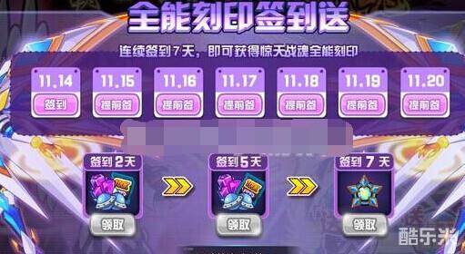 11.14-11月20日期间,坚持签到7天就可领取到惊天战能全能刻印啦!