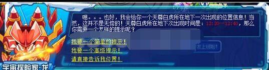 探险家龙会告诉我们天尊·白虎会在12点20-12点40分之间出现,到时候我们可以来和探险家龙了解出现地点情况。这个出现地点和时间不是固定的,大家要经常来看看探险家龙所说的内容。