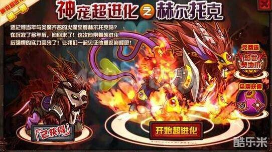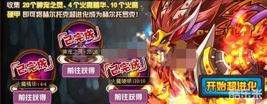 收集4个火魔精华、20个神宠之灵、10个火魔硬甲就可把赫尔托克超进化成为赫尔托罗克啦!同时12月5日-12月11日连续签到7天可领取到3个专属刻印。