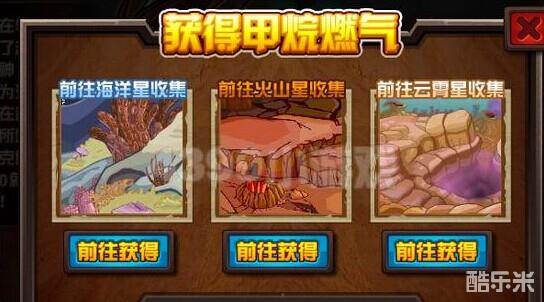 甲烷燃气可在海洋星、火山星、云霄星获得,点击即可收集。需要10个甲烷燃气。