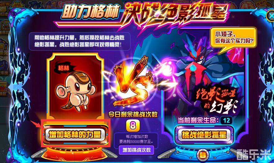 赛尔号邪影初现,小赛尔们可以在航行日志中挑战绝影孤星来获得这个帅气的精灵,挑战中玩家必须参与小游戏来增加格林的力量。