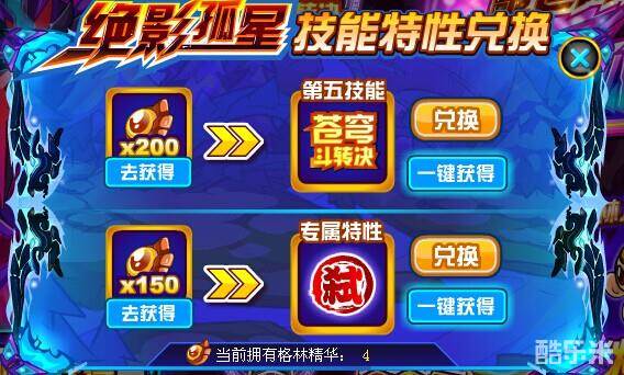 绝影·孤星的第五技能和专属特性,都可用格林精华兑换。