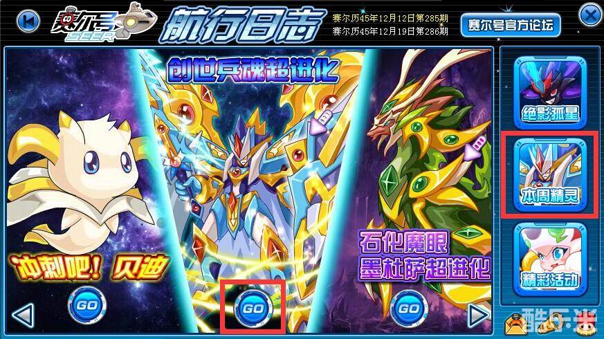 登录赛尔号,点击左上角的航行日志,选择右侧第二个方块,点击【创世兵魂超进化】的GO按钮。