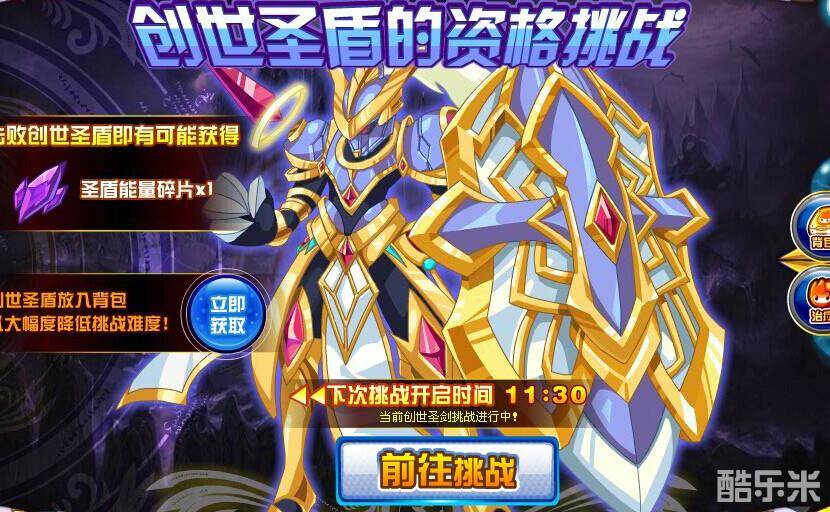 点击相应创世神兵的【获得】按钮,可进入到相应挑战活动。小编点了创世圣盾的按钮进到页面来,每次打败创世圣盾可获得1个圣盾能量碎片,需要挑战10次。如果你把创世圣盾放在背包里面挑战难度会大大降低哦!