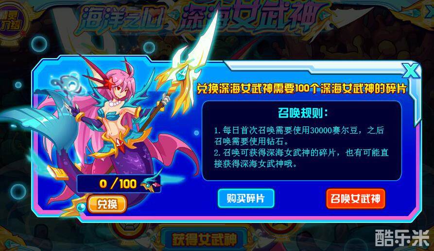 深海女武神的获得,同神·阿波罗的获得方式类似,都是通过召唤获得。每天首次召唤消耗30000赛尔豆,之后召唤需要消耗钻石。召唤可以获得深海女武神的碎片,也可能直接获得深海女武神。100个深海女武神的碎片可以兑换深海女武神。