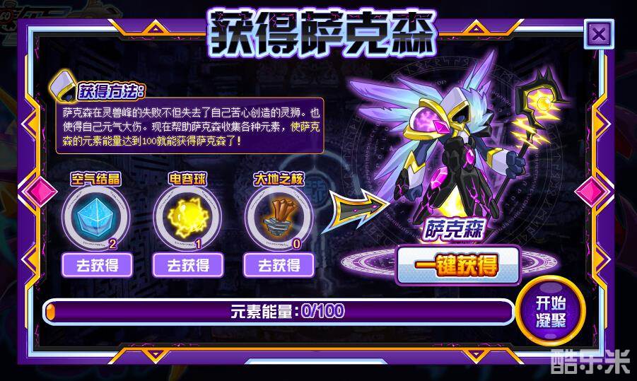 获得萨克森可以一键49钻石获得,或者完成三个收集任务:分别收集空气结晶、电容球和大地之核,使萨克森的元素能量达到100就可以获得萨克森了。