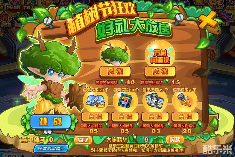 获得的希望种子就去挑战树灵守卫吧,对战可获得大树精华哦!有了40个大树精华可兑换一个树灵守卫,15个大树精华兑换一个万树向春诀。