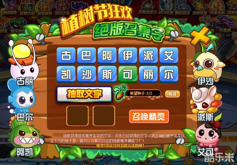 植树节狂欢 绝版召集令 2个种子点亮一个字。抽取获得组成精灵名字的文字,点击已经获得的文字,将正确的精灵名字放在下方的格子里,就可以召唤出对应的绝版精灵捕捉了!!精灵5回合对战后就会逃跑哦!!