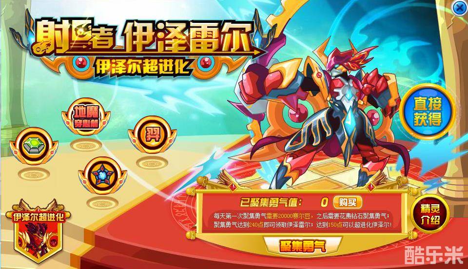 跳过一段开头动画,进入活动。伊泽尔超进化活动是个免费活动,需要消耗赛尔豆聚集勇气值。每天第一次聚集勇气值需要20000赛尔豆,之后需要花费钻石。(点击活动界面下方的“聚集勇气”按钮,即可聚集勇气值咯!每天第一次使用赛尔豆聚集一次,可获得随机点数的勇气值。)