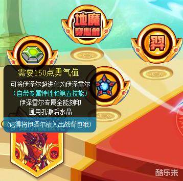 当勇气值达到150点时,可以将伊泽尔超进化为伊泽雷尔(自带专属特性和第五技能)、伊泽雷尔专属全能刻印、通用孔激活水晶。