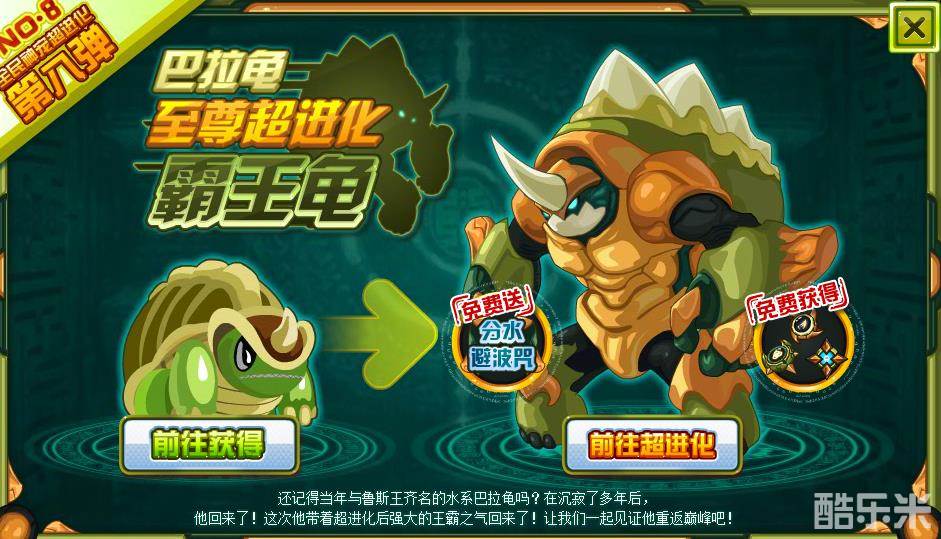 以上就是赛尔号巴拉龟超进化霸王龟的获得方式了,是不是很简单呢?赶紧去获得吧!祝大家游戏愉快!!