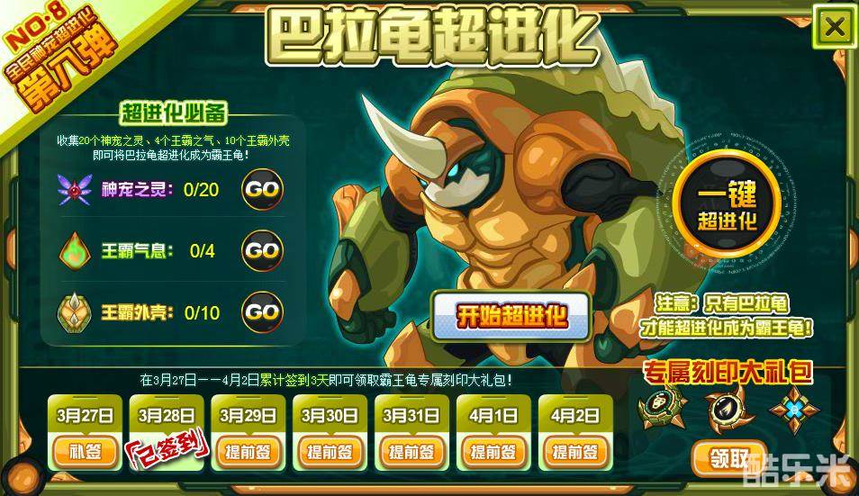 获得巴拉龟以后,就去参与超进化活动吧。我们可以通过两种方式获得霸王龟,一种是直接298钻石一键获得,另外一种是参加简单活动获得。霸王龟专属刻印大礼包只需要签到三天即可获得。