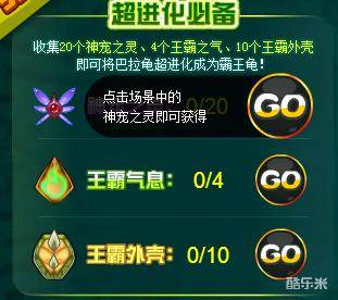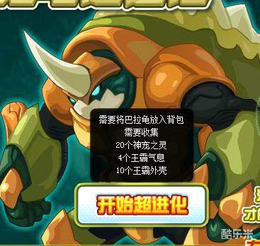 对巴拉龟超进化需要集齐20个神宠之灵,4个王霸气息,10个王霸外壳。