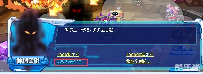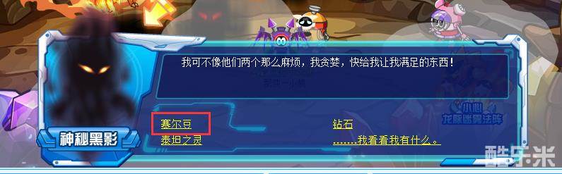 左下角的黑影给出大家4个选项,要求我们选择给他哪个好处。反正都是要给的,我们就选择“赛尔豆”吧!相比钻石和泰坦之灵来说,感觉稍微好些。