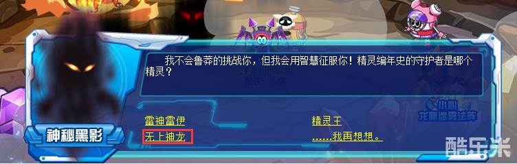 中间的黑影是喜欢给大家出问题啦!大家回答对了就可以过关。精灵编年史的守护者是“无上神龙”。