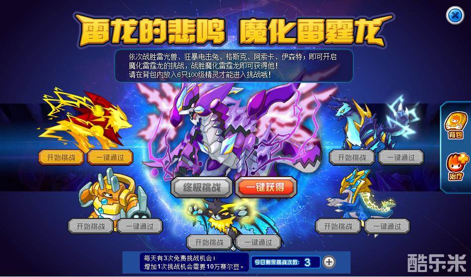 依次战胜雷光兽、狂暴电击兔、格斯克、阿索卡、伊森特,即可开启魔化雷霆龙挑战,战胜魔化雷霆龙即可获得他!挑战先制:背包里有6只100级精灵;每天免费挑战3次,10w赛尔豆可以增加1次挑战机会。
